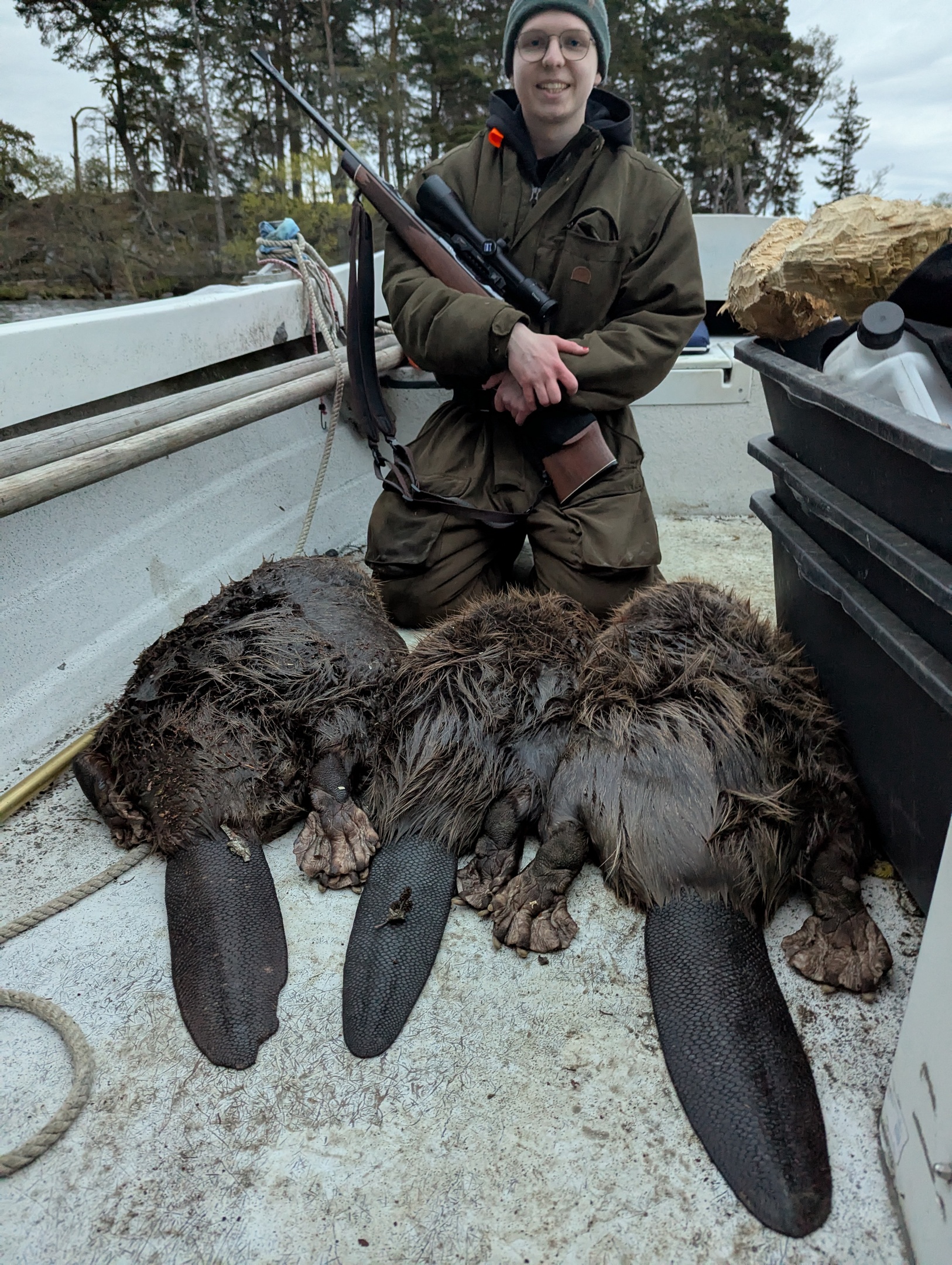 En fälld bäver per jägarer, men finns jaktljus kvar, åker vi till en hydda vi försöker hålla hårt tryck på, där ska allt skjutas (vilket vi aldrig lyckats med, det kommer nya bävrar hela tiden), lyckas vi där också kostar den fällda extra bävern 750:-. Altså, jakten tar inte slut om "vi skjuter efter en kvart".
